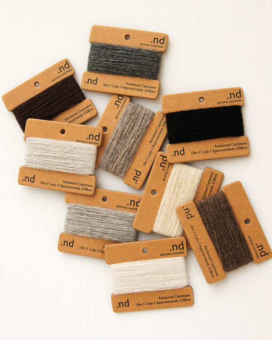 We unpick garments and unravel the yarn course-by-course to strip each piece back to basics to create long lengths of beautiful, 100% reclaimed cashmere yarn. Each spool is made from recycled and recyclable card and is a stand alone object in any repair kit or sewing box.