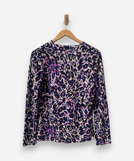 Purple Leopard Print Cashmere Round Neck Cardigan by Anne Klein